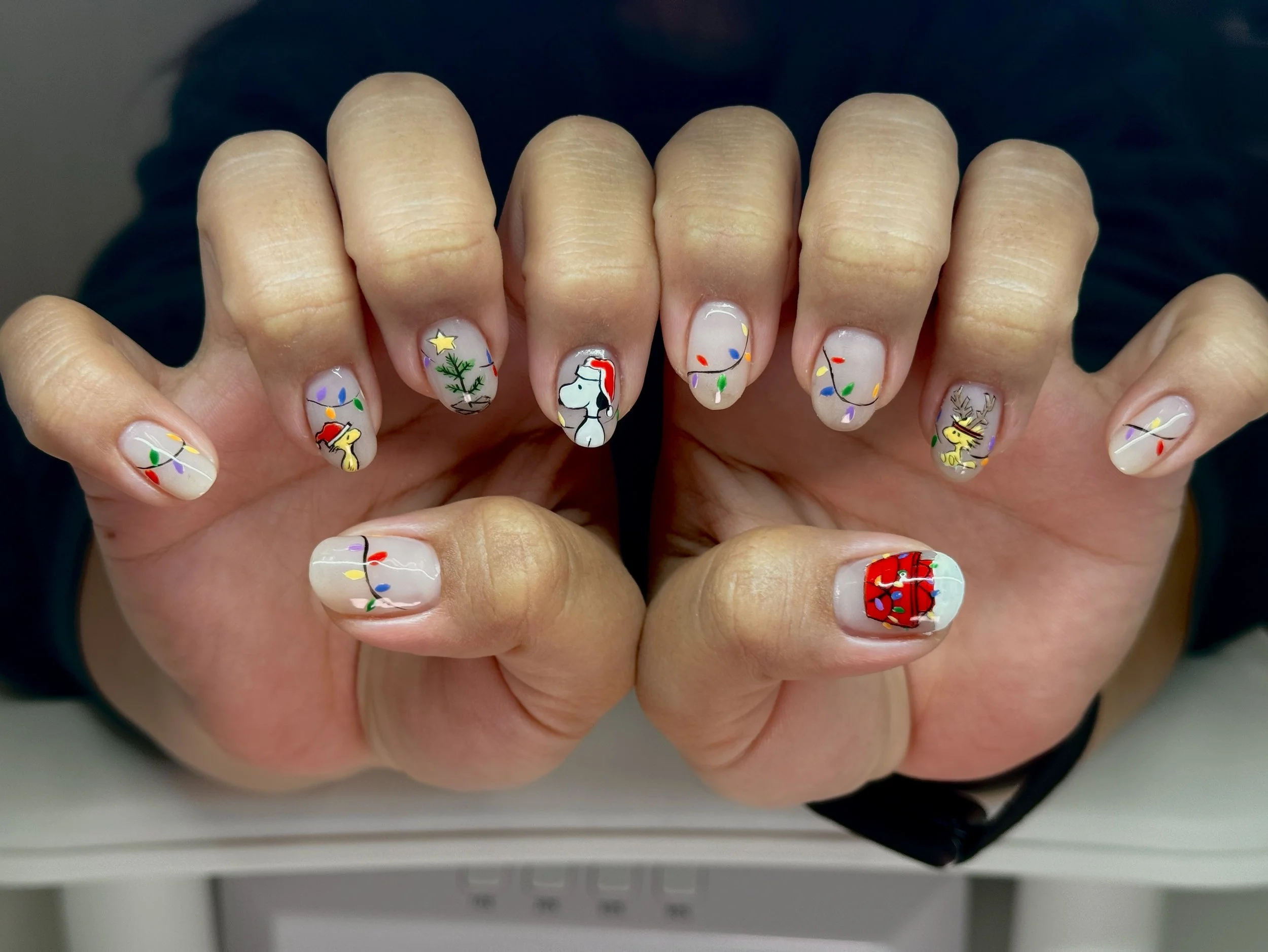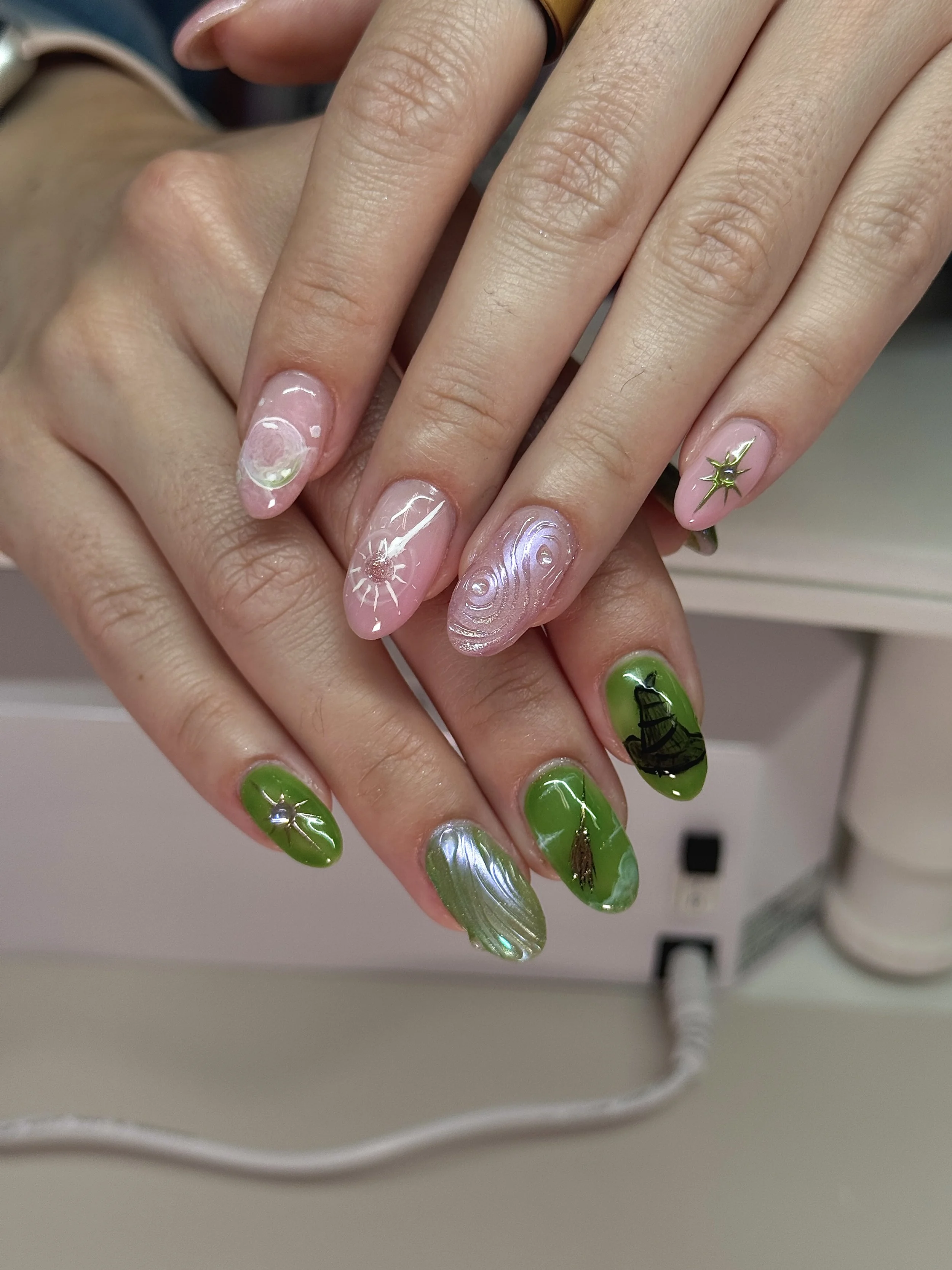 Complex nail art, unlimited charms, detailed painted character art, 3+ custom charms made with 3d gel clay, unique elements and crazy designs
